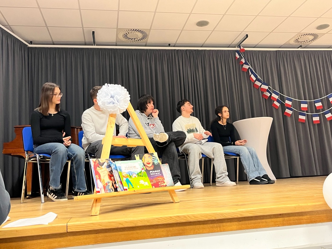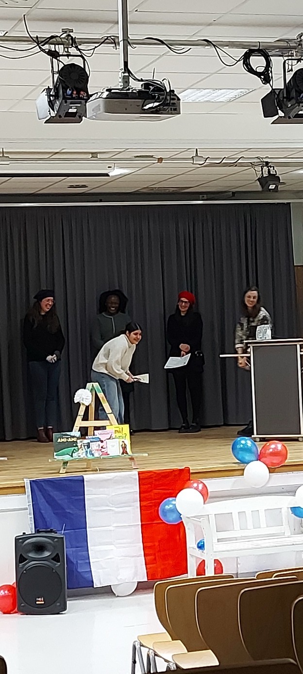 Ein herzliches Dankschön richtet der Fachbereich Französisch an den Förderverein, der die Geschenke für die diesjährigen Gewinnerinnen und Gewinner zur Verfügung gestellt hat und an Sean Jared Mandaric aus der Klasse 9g, der an diesem Vormittag gemeinsam mit Frau Henning die Moderation übernommen hat.