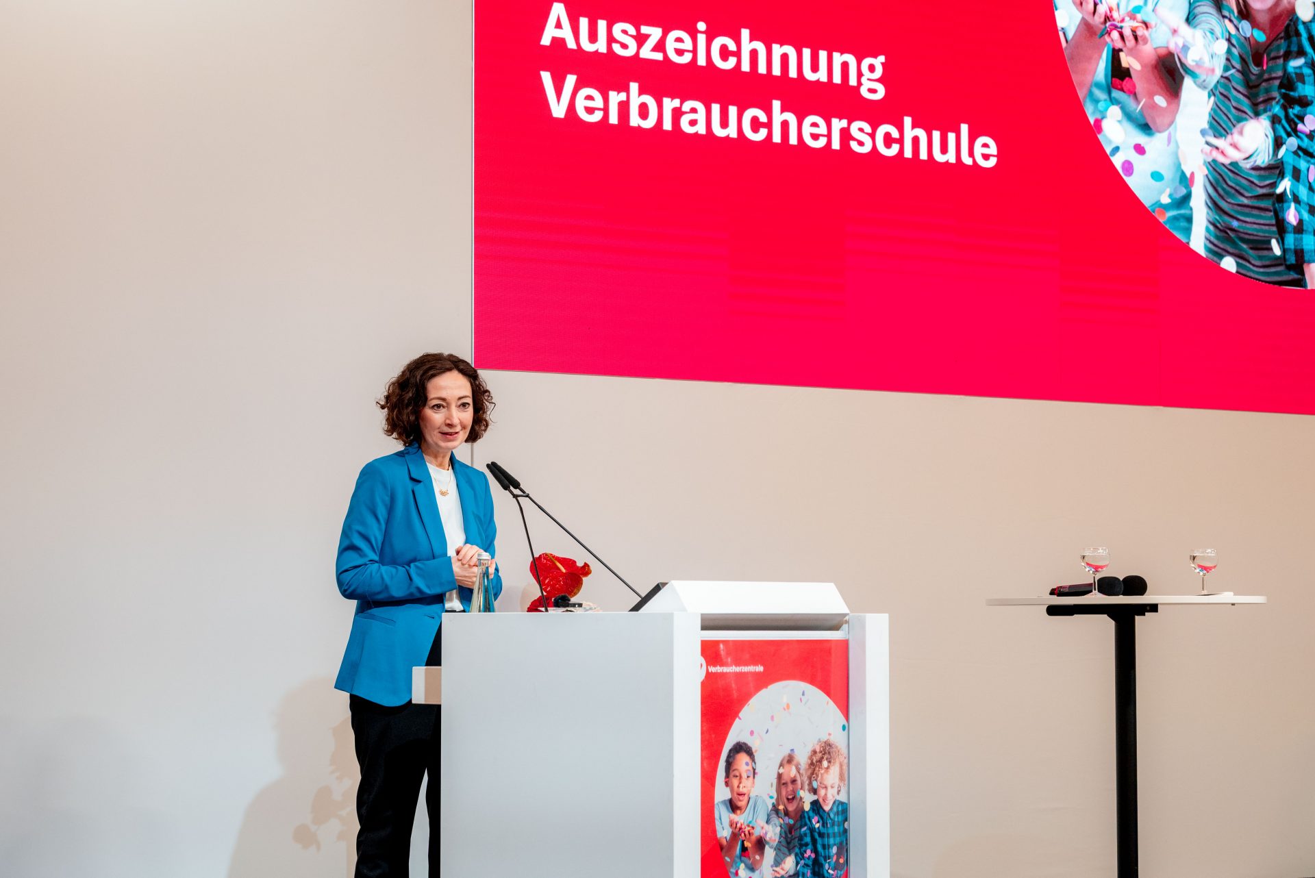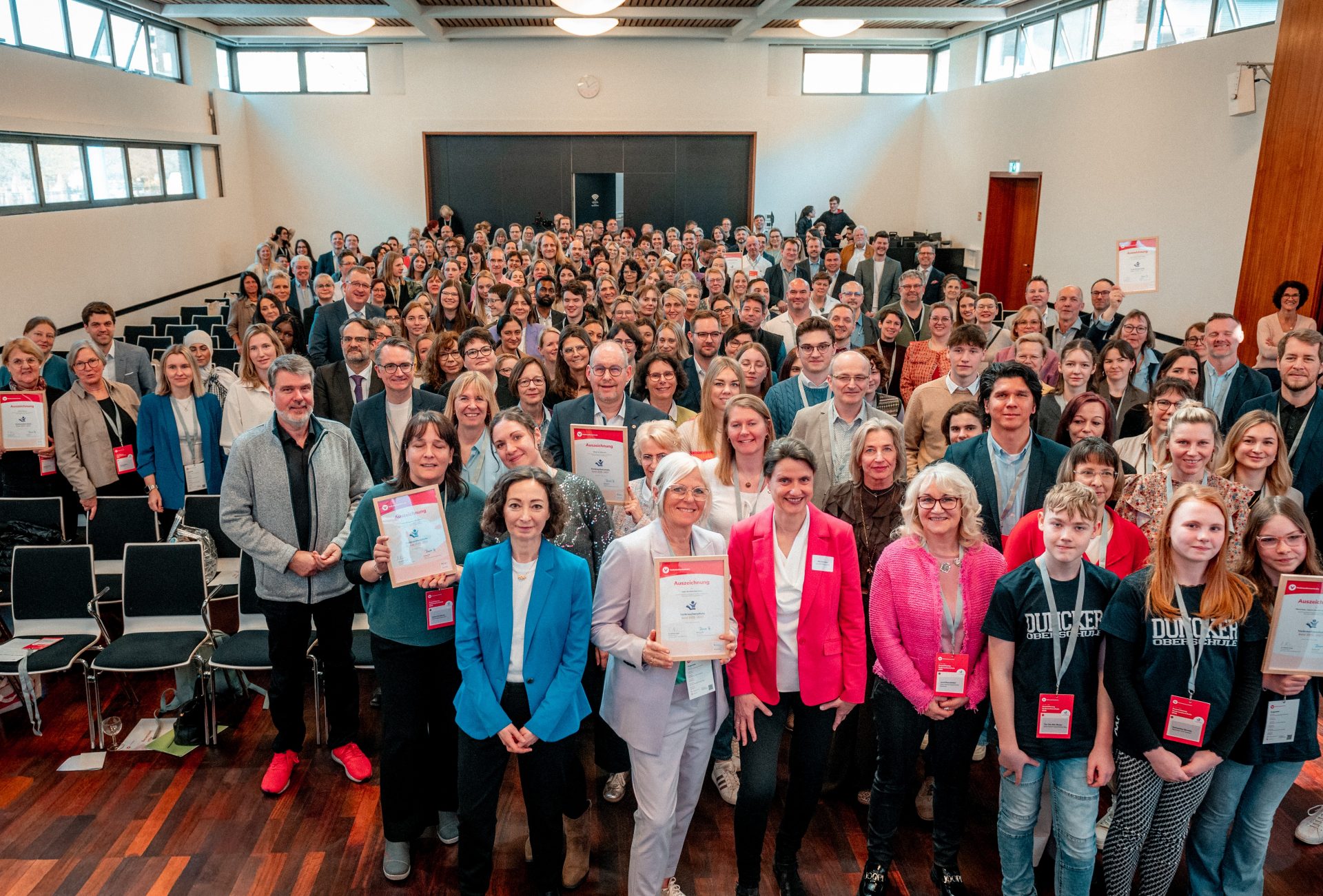 Aus Flensburg und Saarbrücken, aus Dresden und Bruchköbel: Lehrkräfte und Schülerinnen und Schüler von 100 der insgesamt 121 Verbraucherschulen 2026 waren am 23. März 2026 nach Berlin gereist. Im Tagungswerk Berlin, das mit 240 Gästen bis auf den letzten Platz gefüllt war, erhielten sie in feierlichem Rahmen ihre Auszeichnung als Verbraucherschule. Schirmherrin Bundesverbraucherschutzministerin Dr. Stefanie Hubig und Ramona Pop, Vorständin des Verbraucherzentrale Bundesverbands, nahmen sich Zeit, um jeder Schule persönlich zu gratulieren und die Urkunden zu überreichen.