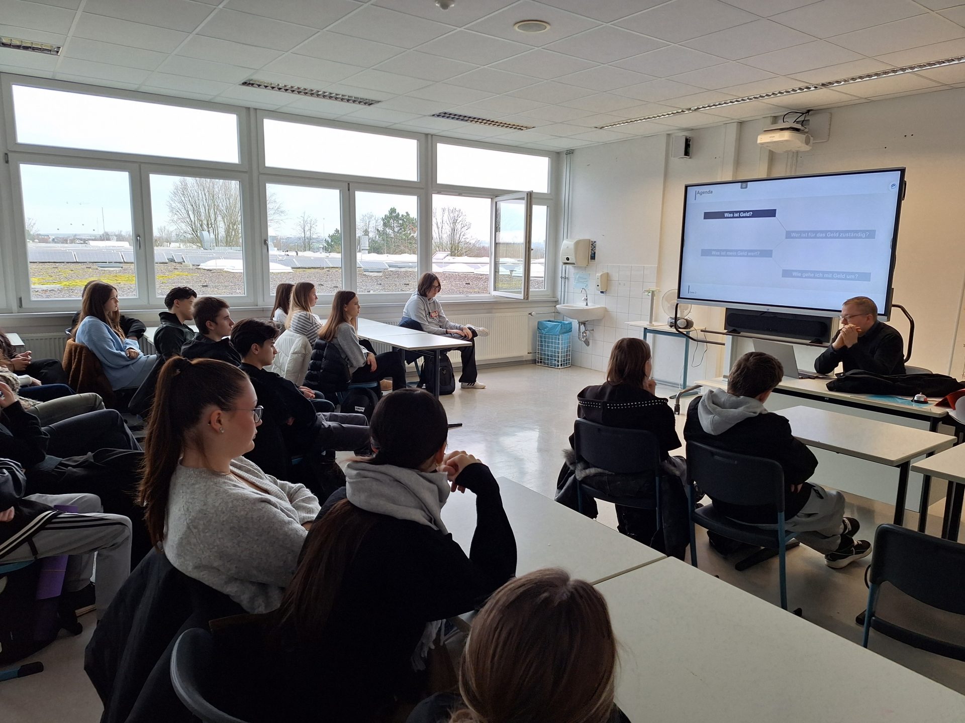 Heute hielt ein Vertreter der Deutschen Bundesbank aus Frankfurt für zwei Klassen des Jahrgangs 10 einen interessanten Vortrag zum Thema „Geld verstehen „. Der Referent erläuterte in einem kurzweiligen Vortrag die verschiedenen Funktionen des Geldes, woraus sich auch unterschiedliche Eigenschaften wie beispielsweise Fälschungssicherheit und Teilbarkeit ergeben.