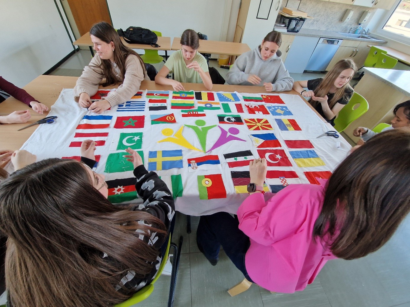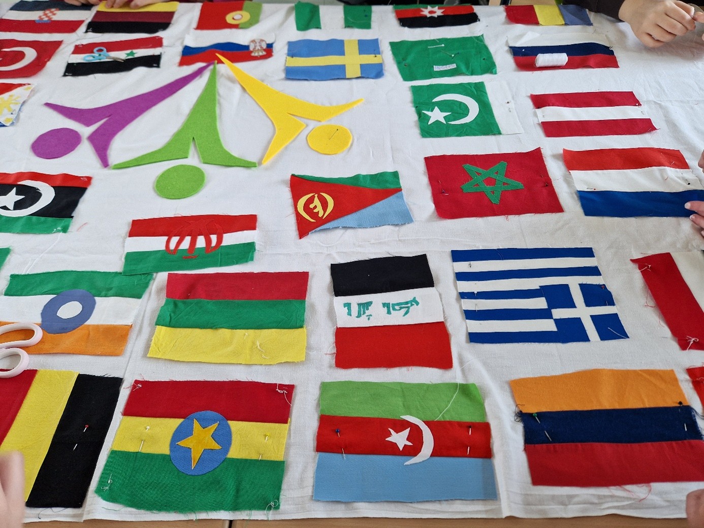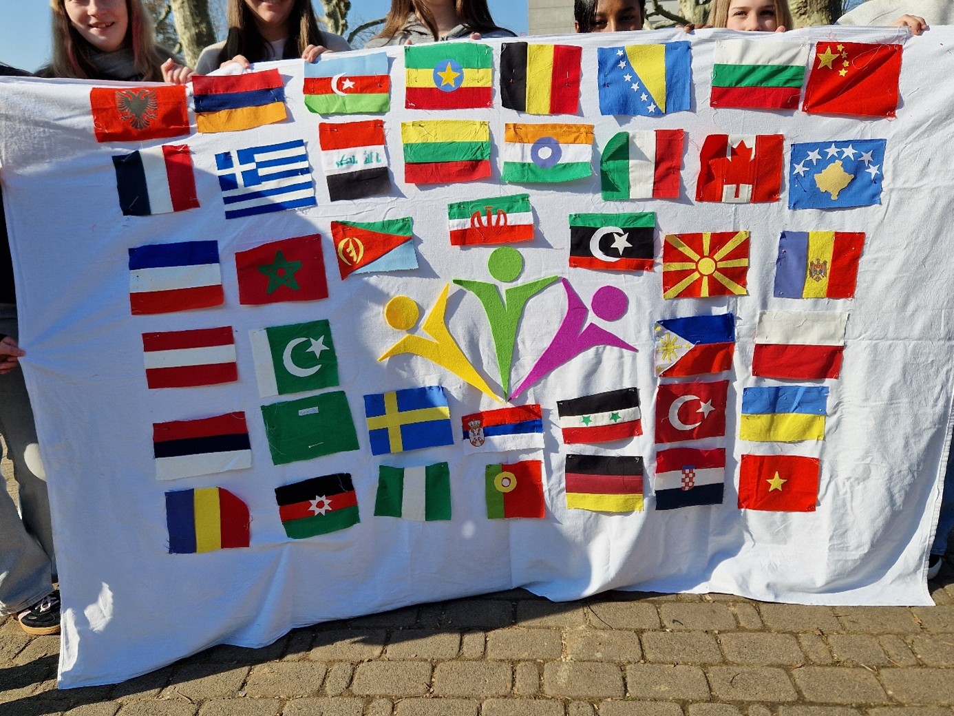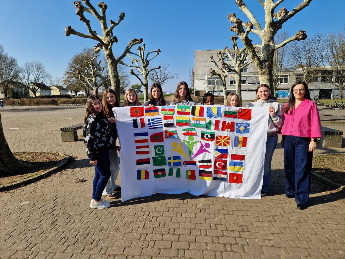 Auf einem Banner kommen verschiedene internationale Flaggen zusammen, die die Schülerinnen in Einzelarbeit angefertigt haben. Symbolisch steht das „große Ganze“ für die Heinrich-Böll-Schule als Ort des gemeinsamen Lernens, an dem verschiedene Kulturen und Herkunftsländer sowie Fremd- und Muttersprachen zusammenkommen.