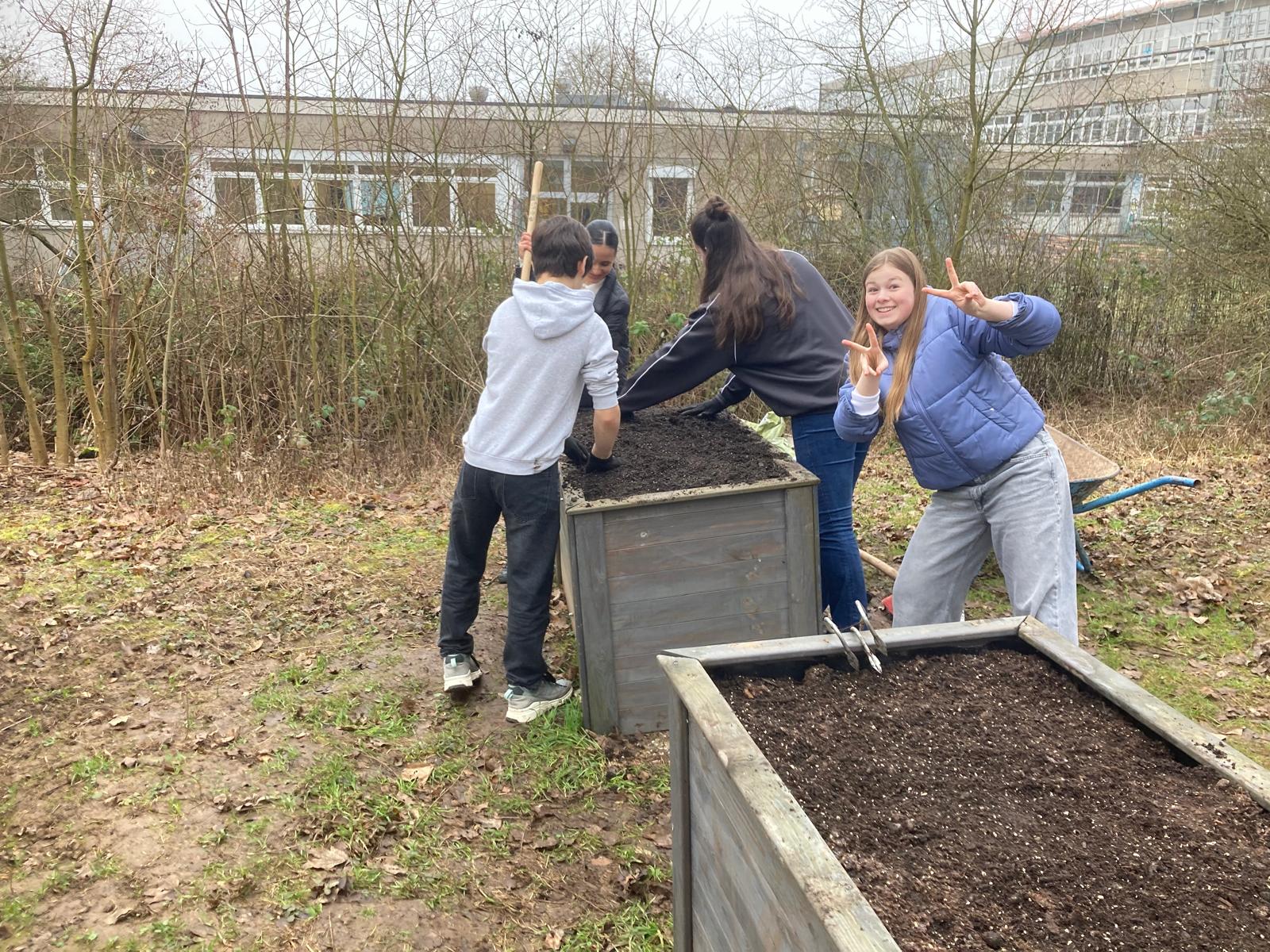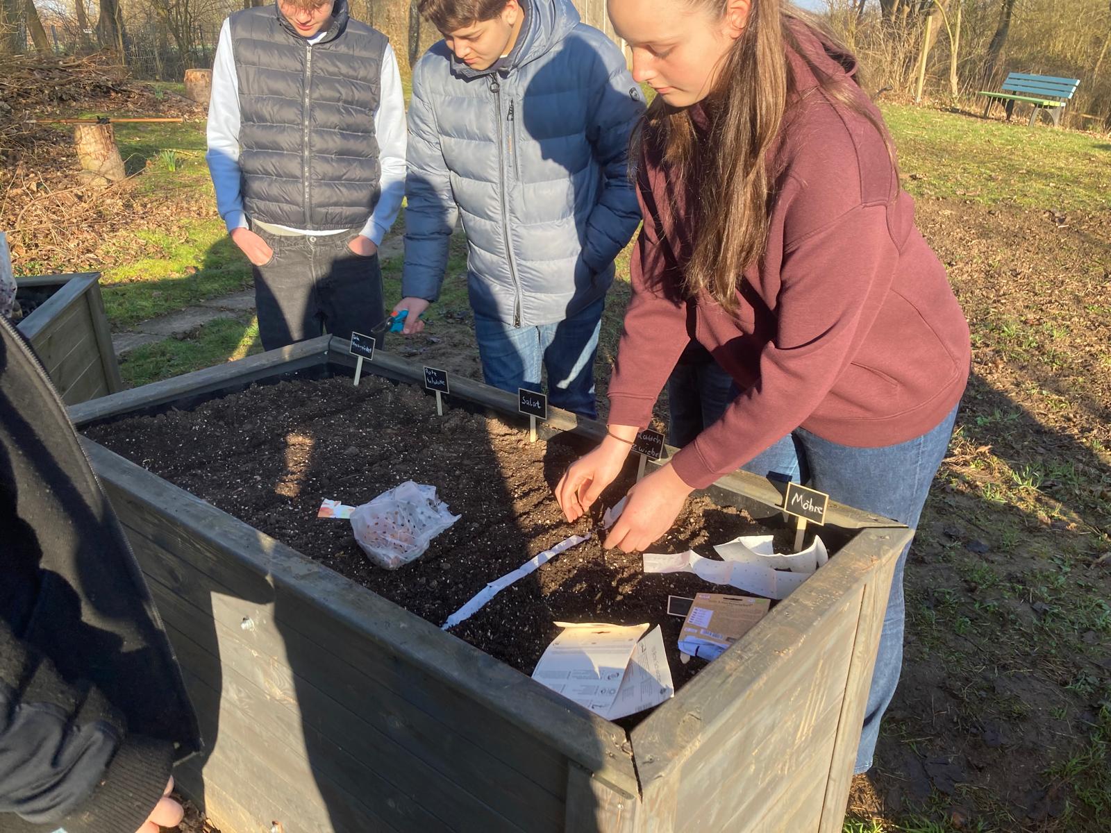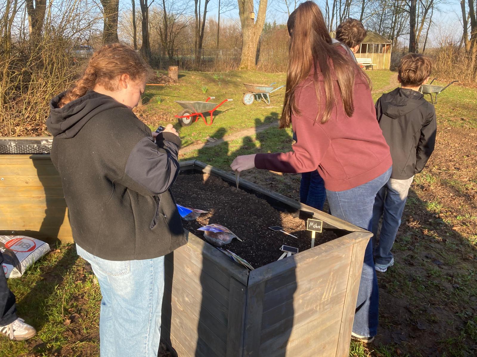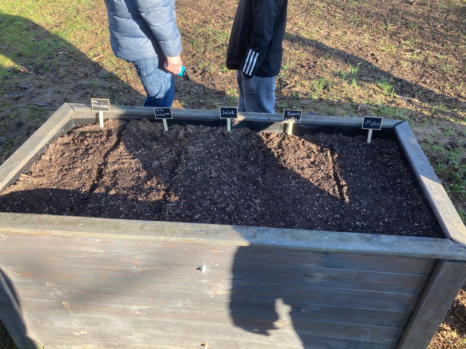 Wir haben die im letzten Jahr gebauten Hochbeete befüllt und die ersten Pflanzen gesät.