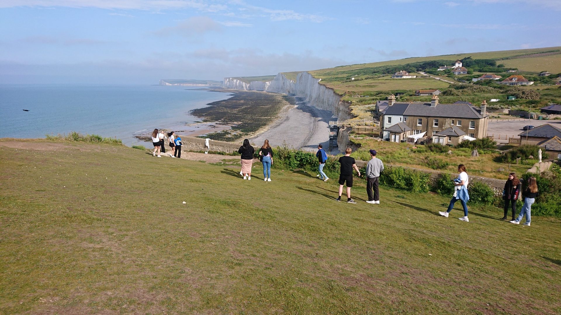 Auf dem Rückweg machten wir noch einen Stopp an Beachy Head, einer Klippe hoch oben über der Steilküste, bekannt aus mancherlei Filmen im englischsprachigen Raum. Die Warnungen der Lehrer, nicht zu nah an die Kante zu gehen, wurden von den Schülern erhört, nachher fehlte keiner im Bus. War das vielleicht auch der Erwartung auf ein gutes Abendessen in der Gastfamilie geschuldet?
