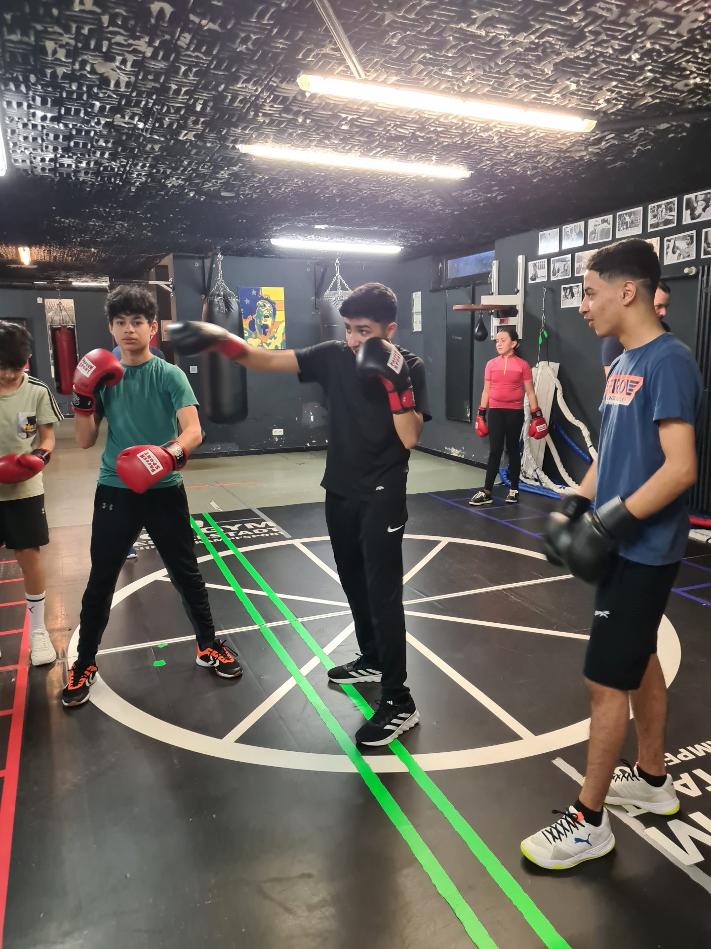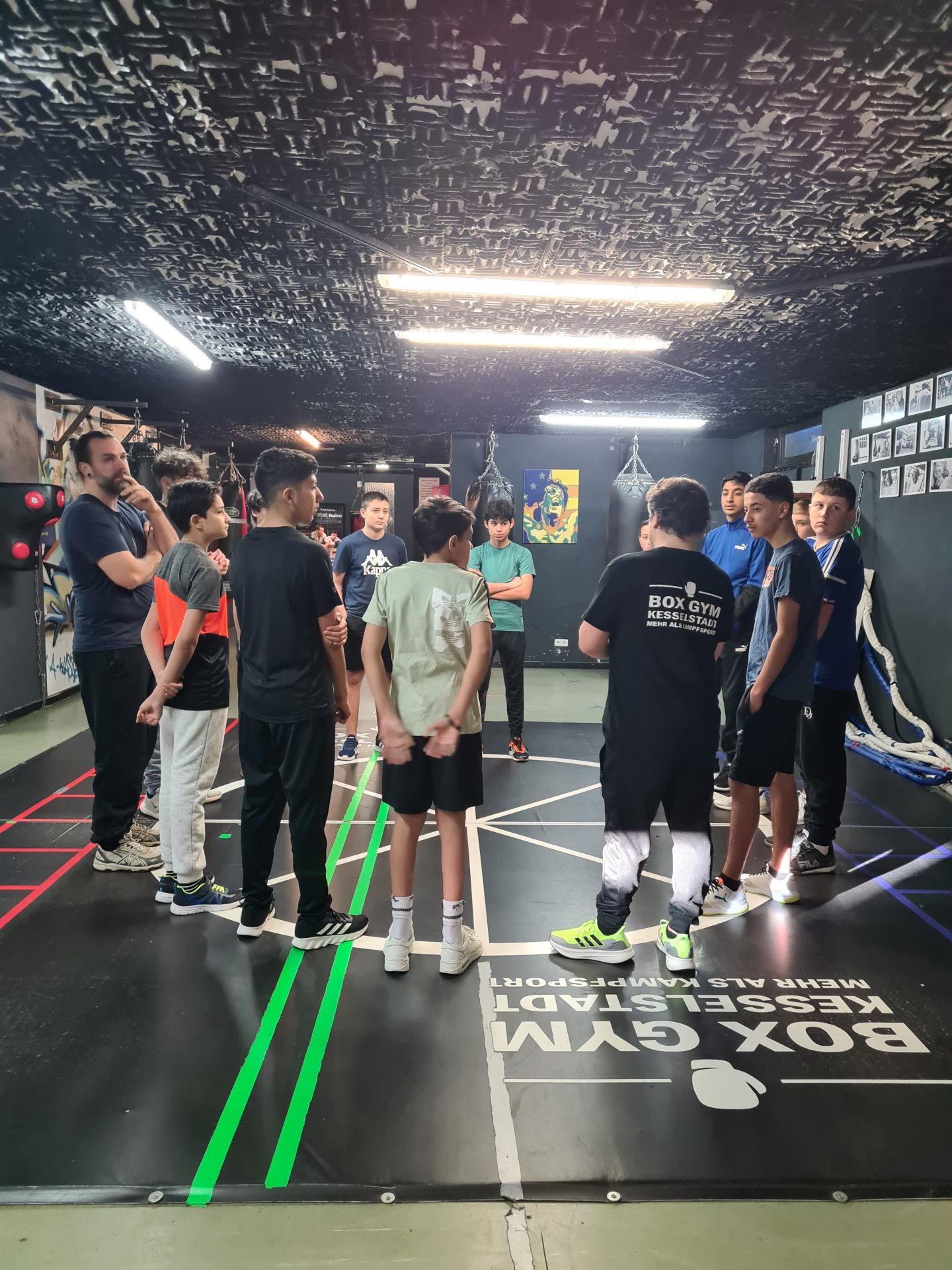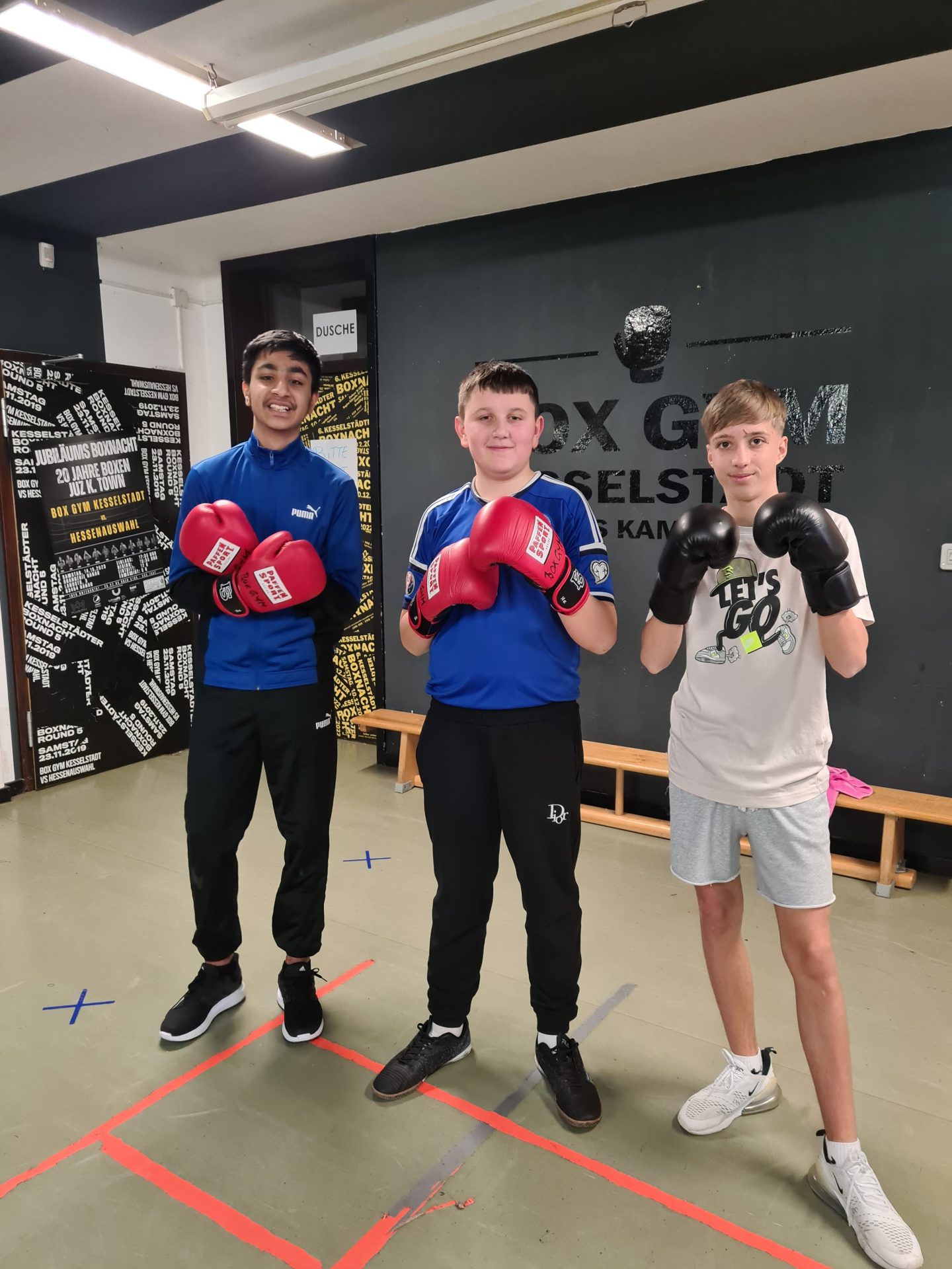 Einige Schüler und eine Schülerin der Intensivklassen besuchten am Mittwoch., 29.01.25 mit Herrn Prey und Frau Beyer das Boxangebot des Jugendzentrums Kesselstadt. Der erfahrene Trainer Davut Demir hat uns an diesem Tag in positivem Sinne an unsere Grenzen gebracht! Nach einem musikunterstützen Aufwärmtraining spürten wir zunächst, wie lange fünf Minuten sein können, wenn man sie mit Seilspringen verbringt! Hier kamen die ersten Schüler schon ins Schwitzen, aber Dank der ansteckenden Motivation von Davut haben alle gut durchgehalten.