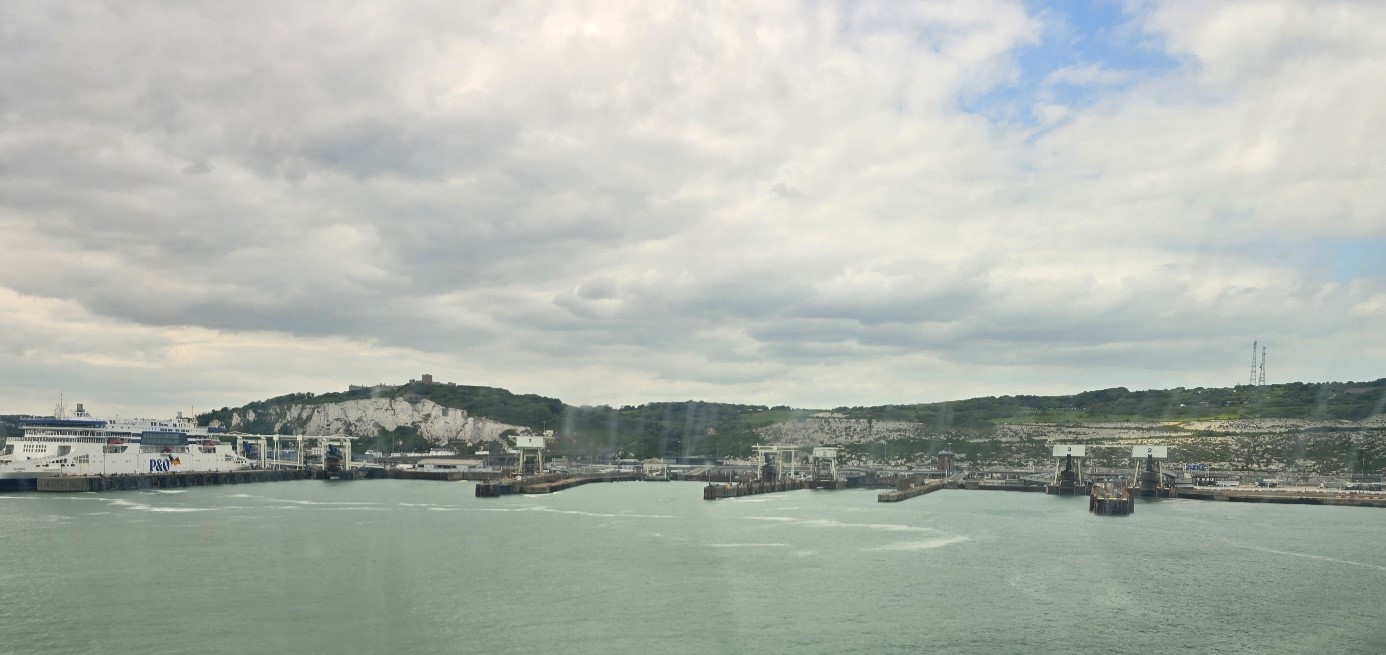 Am Sonntag ging es schon früh los – Abfahrt des Busses: 3 Uhr. Und alle waren pünktlich und mit Vorfreude da. Die Fahrt verlief problemlos bis Calais. Eine merkwürdige Ausschilderung der Umleitung führte uns im Kreis, was uns viel Zeit kostete. Endlich am Hafen, wurden unsere Nerven auf die Probe gestellt: das Einscannen der 44 Pässe unserer Gruppe schlug gleich zweimal fehl und klappte erst beim dritten Mal. Würden wir die Fähre noch schaffen? Immerhin kam noch die französische und dann die britische Passkontrolle. Unerwartet zügig kamen wir durch, dann schnell in den Bus – und als letztes Fahrzeug fuhr unser Bus auf die Fähre, dann legte sie ab. Puhh. Die Begleitlehrer Herr Sauer, Herr Öfner und Frau Kalweit waren sichtlich erleichtert. Schon bald grüßten die Kreidefelsen von Dover und die Weiterfahrt nach Oxford war planmäßig.
