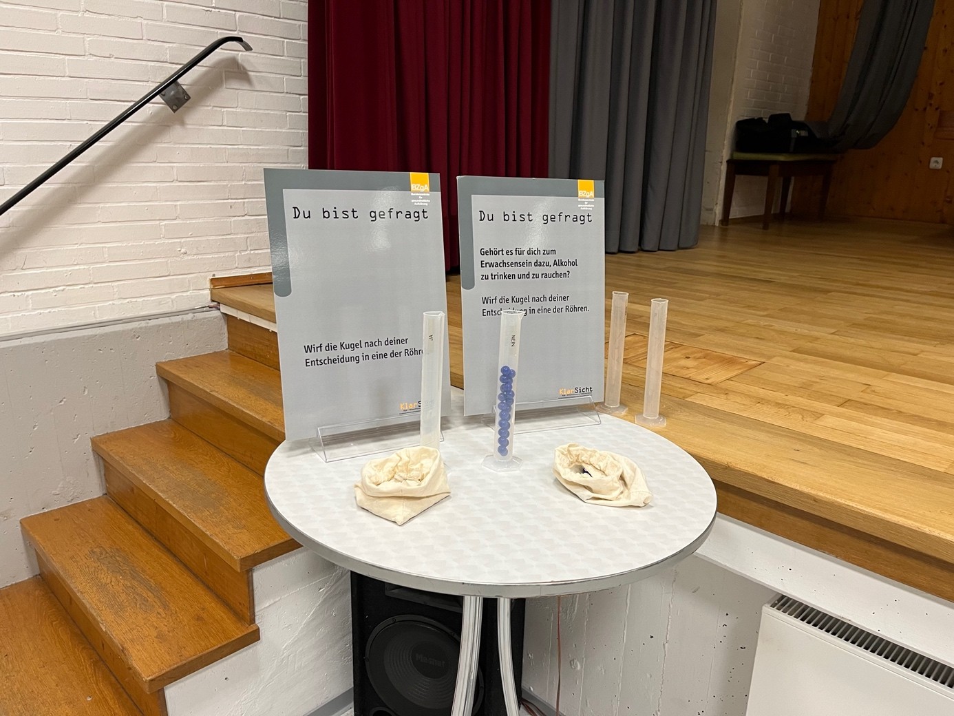 Dabei haben besonders die „Rauschbrillen“ bei den Schülerinnen und Schülern Eindruck hinterlassen. Bei diesem freiwilligen Mitmachangebot konnte durch Aufsetzen der „Rauschbrillen“ erlebt werden, welche negativen Auswirklungen Alkohol auf das Reaktionsvermögen und die Koordinationsfähigkeit hat. Ein Schüler zog im Anschluss an das Mitmachprojekt ein passendes Fazit: „Das war krass. Lasst die Finger vom Alkohol. Don´t drink and drive. Außerdem macht das Zeug krank.“