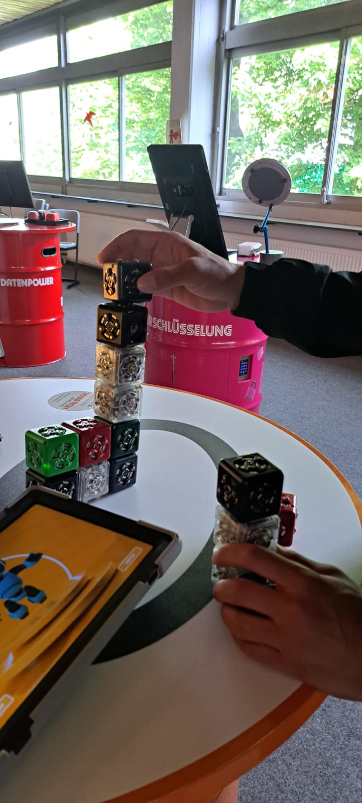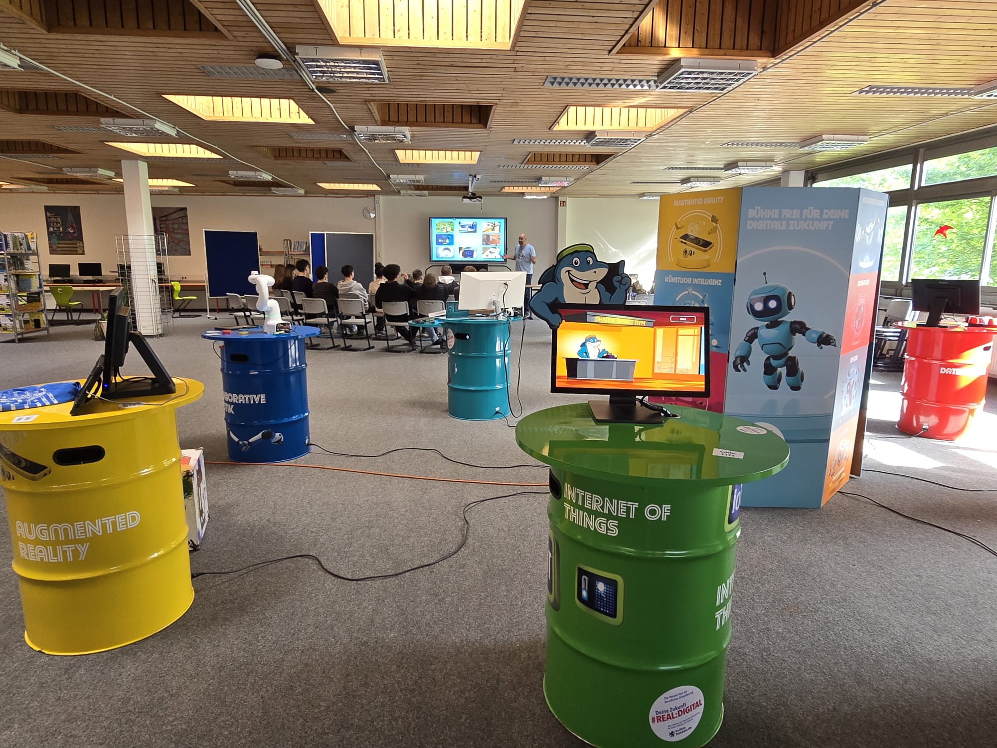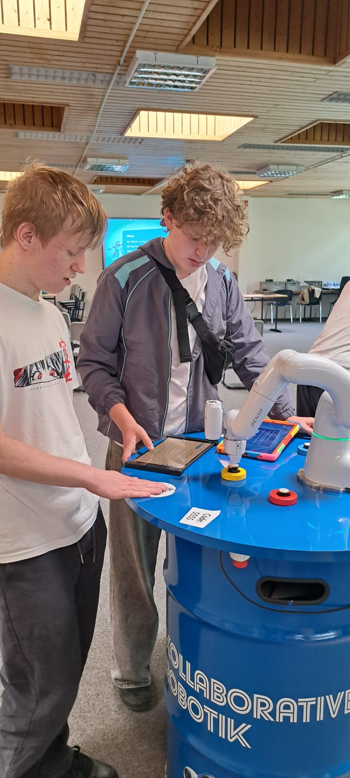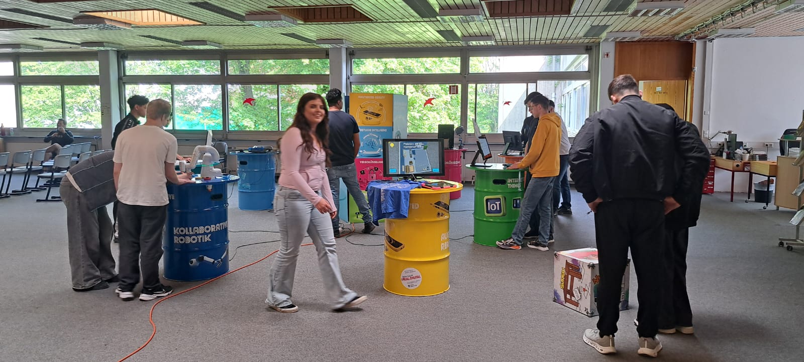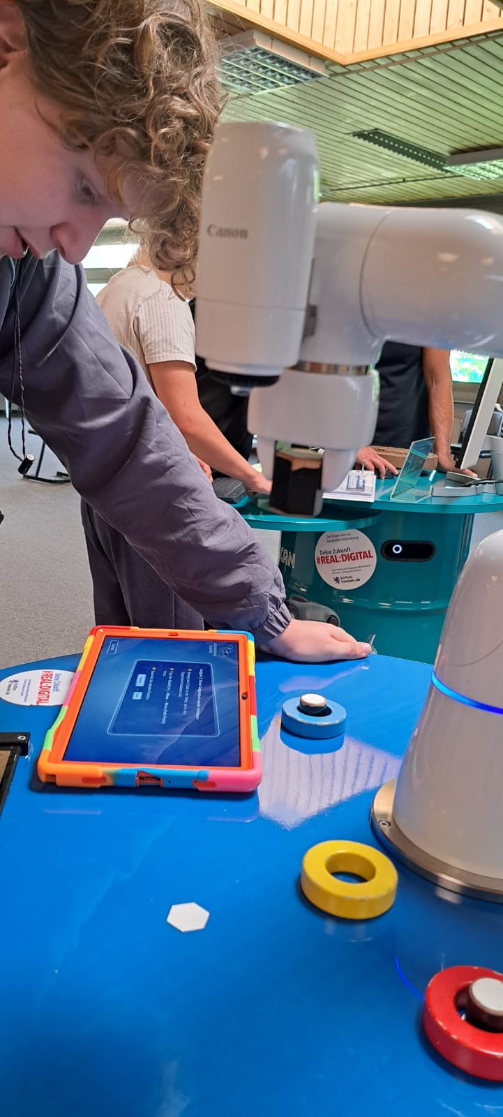 Für Schülerinnen und Schüler der Integrierten Gesamtschule bieten die Digi-Coaches Lisa Morath, Philipp Mertin und Fabio Benini einen 90-minütigen, interaktiven Rundgang an. Die Schülerinnen und Schüler erwarten insgesamt acht Stationen, die jeweils eine digitale Schlüsseltechnologie vorstellen. Dazu gehören kollaborative Robotik, das Internet der Dinge, Künstliche Intelligenz, Augmented Reality, Sensorik, Verschlüsselung, 3D-Scan sowie Big Data. Aufgeteilt in Kleingruppen lösen die Schülerinnen und Schüler an drei dieser Stationen jeweils eine spielerisch gestaltete Aufgabe und lernen dabei die Funktionsweise der vorgestellten Technologie und wie diese in unterschiedlichen Berufsfeldern eingesetzt wird. Informationen dazu erhalten sie im Sinne des Lernens mit digitalen Medien über eine interaktive Lernsoftware auf einem Tablet.