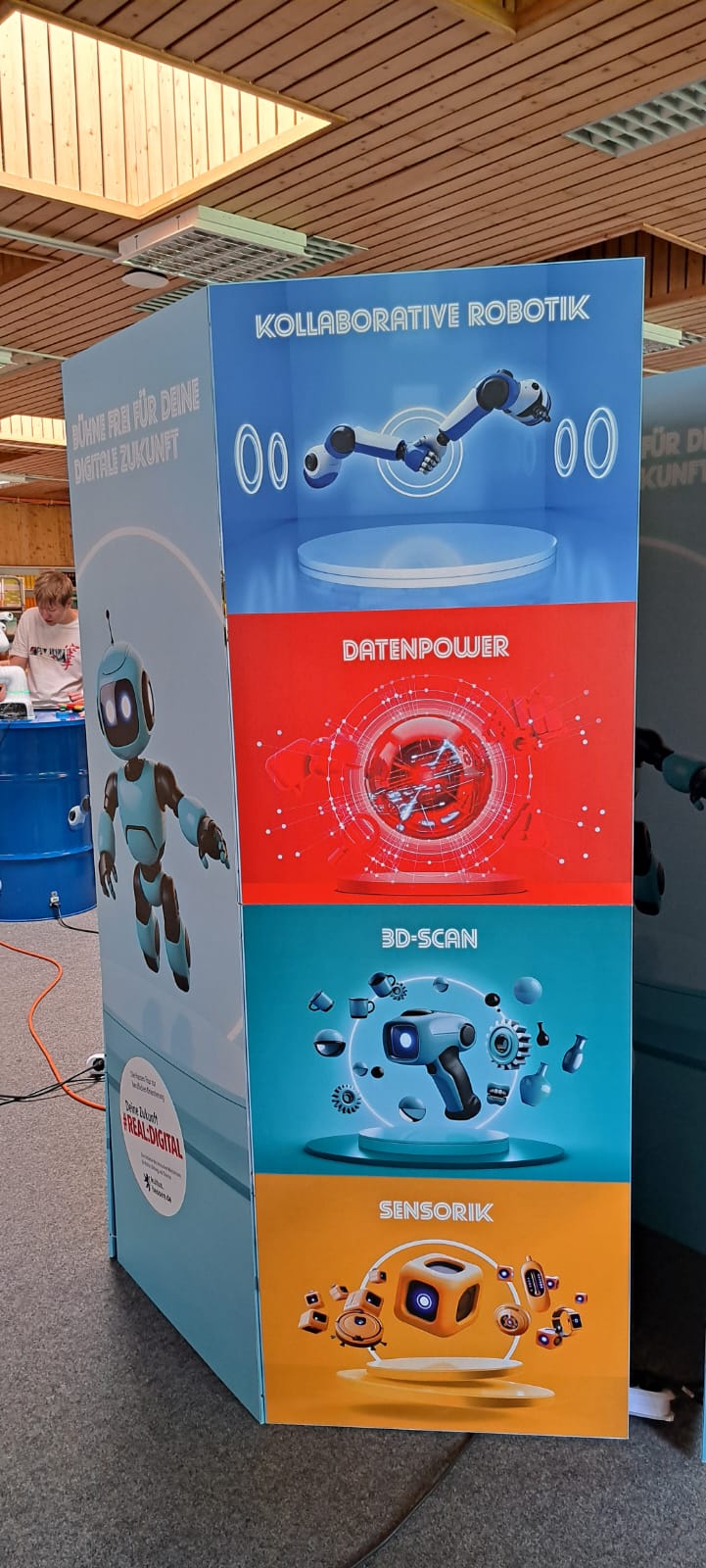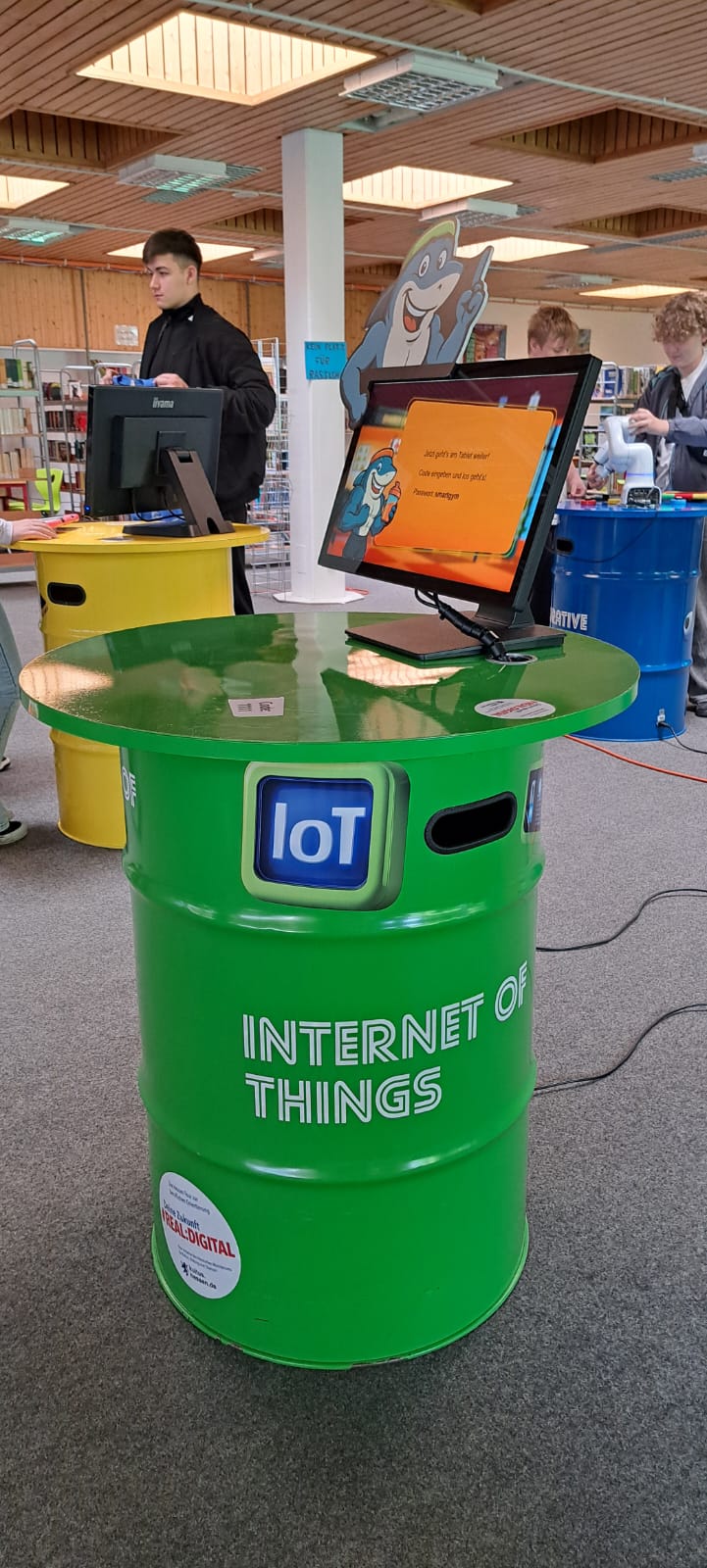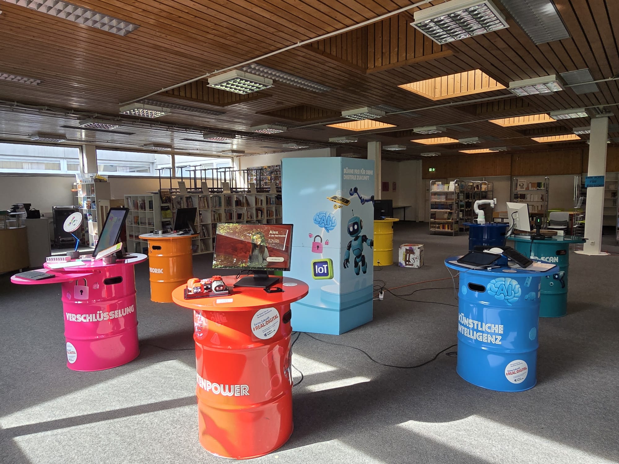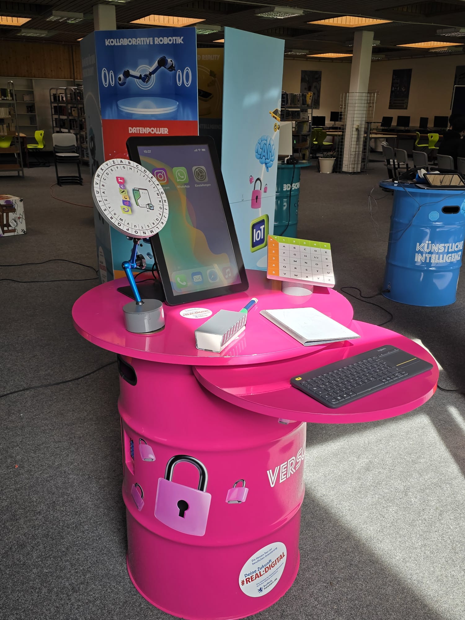 Für Schülerinnen und Schüler der Integrierten Gesamtschule bieten die Digi-Coaches Lisa Morath, Philipp Mertin und Fabio Benini einen 90-minütigen, interaktiven Rundgang an. Die Schülerinnen und Schüler erwarten insgesamt acht Stationen, die jeweils eine digitale Schlüsseltechnologie vorstellen. Dazu gehören kollaborative Robotik, das Internet der Dinge, Künstliche Intelligenz, Augmented Reality, Sensorik, Verschlüsselung, 3D-Scan sowie Big Data. Aufgeteilt in Kleingruppen lösen die Schülerinnen und Schüler an drei dieser Stationen jeweils eine spielerisch gestaltete Aufgabe und lernen dabei die Funktionsweise der vorgestellten Technologie und wie diese in unterschiedlichen Berufsfeldern eingesetzt wird. Informationen dazu erhalten sie im Sinne des Lernens mit digitalen Medien über eine interaktive Lernsoftware auf einem Tablet.