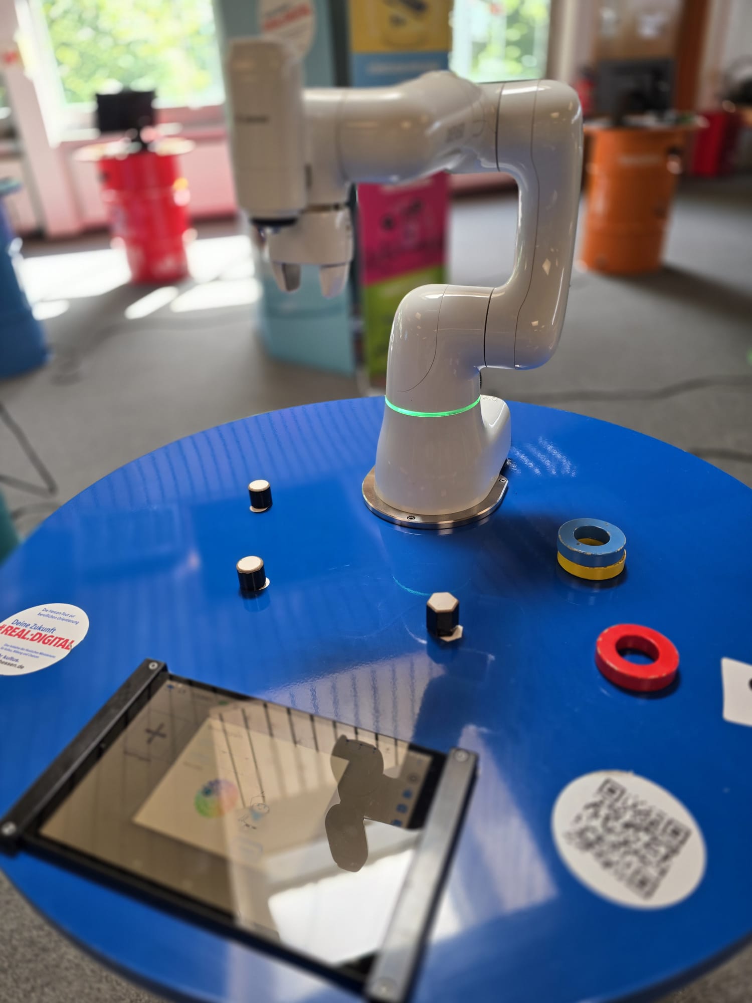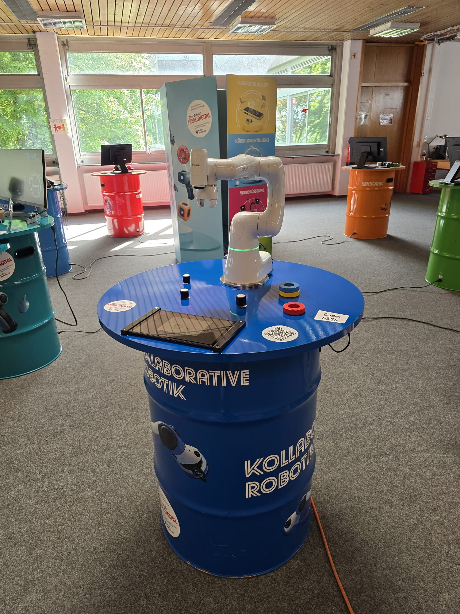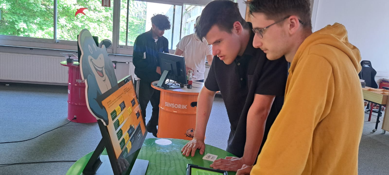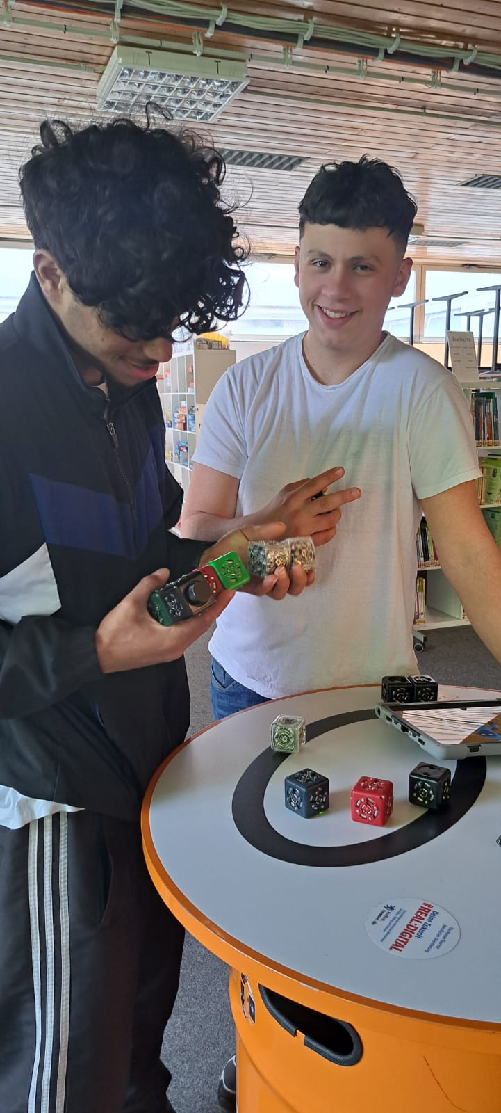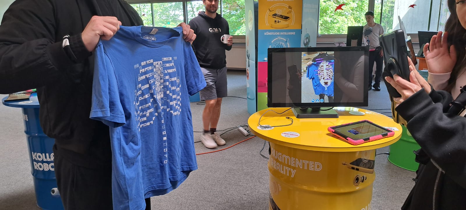 Für Schülerinnen und Schüler der Integrierten Gesamtschule bieten die Digi-Coaches Lisa Morath, Philipp Mertin und Fabio Benini einen 90-minütigen, interaktiven Rundgang an. Die Schülerinnen und Schüler erwarten insgesamt acht Stationen, die jeweils eine digitale Schlüsseltechnologie vorstellen. Dazu gehören kollaborative Robotik, das Internet der Dinge, Künstliche Intelligenz, Augmented Reality, Sensorik, Verschlüsselung, 3D-Scan sowie Big Data. Aufgeteilt in Kleingruppen lösen die Schülerinnen und Schüler an drei dieser Stationen jeweils eine spielerisch gestaltete Aufgabe und lernen dabei die Funktionsweise der vorgestellten Technologie und wie diese in unterschiedlichen Berufsfeldern eingesetzt wird. Informationen dazu erhalten sie im Sinne des Lernens mit digitalen Medien über eine interaktive Lernsoftware auf einem Tablet.