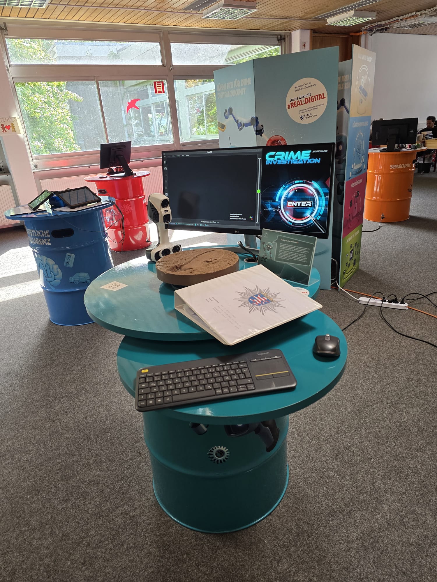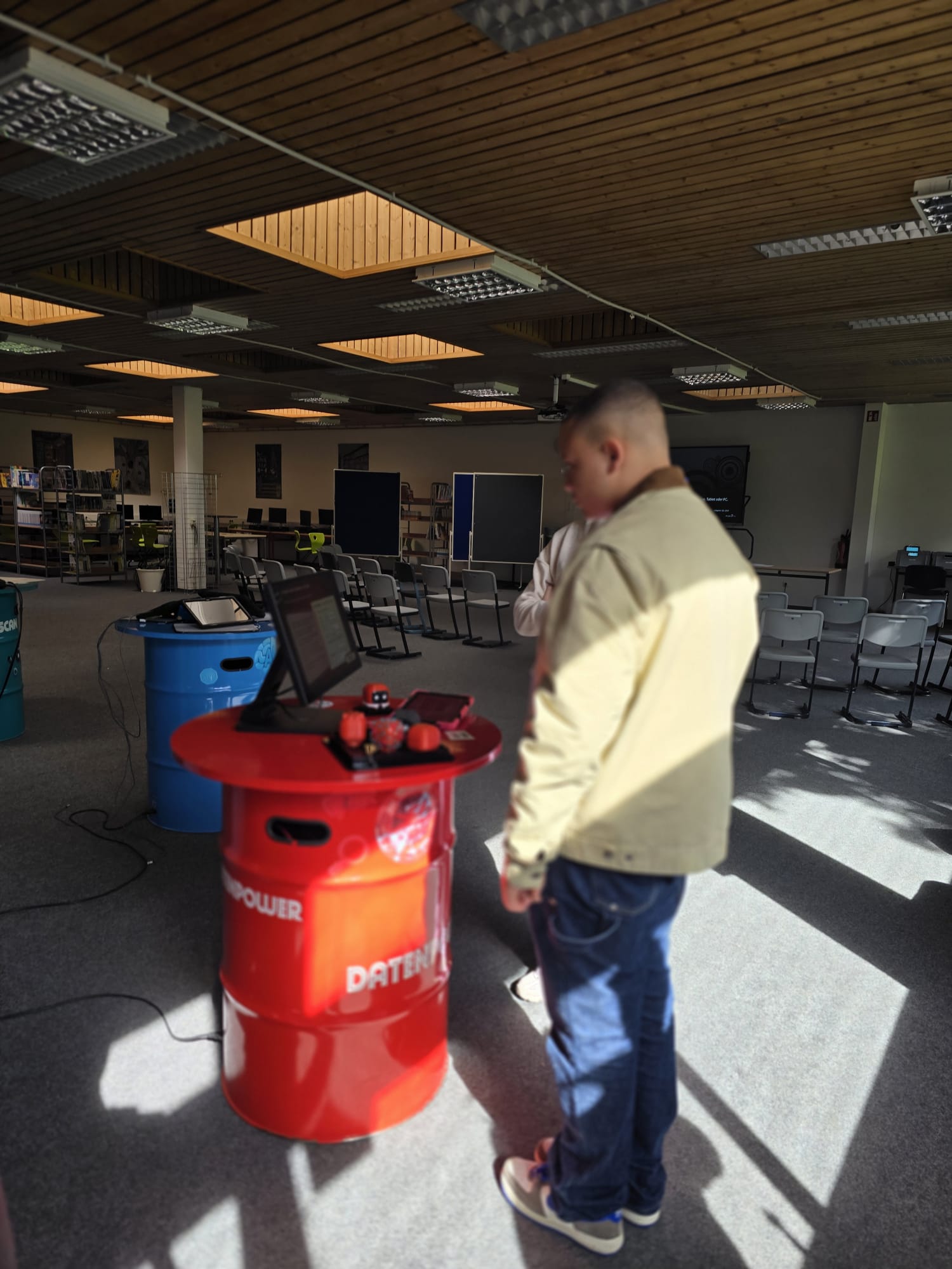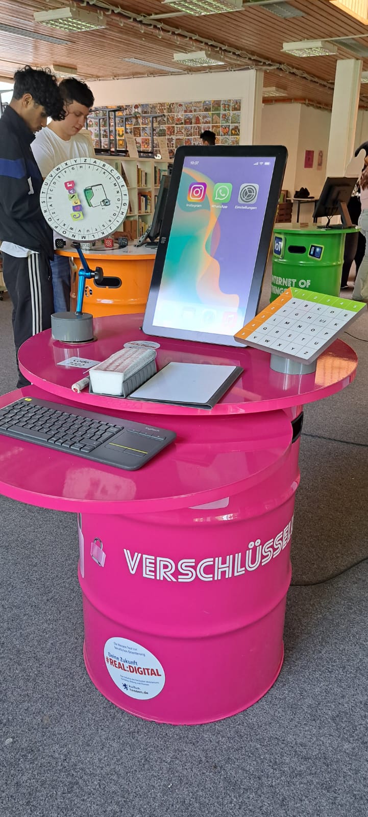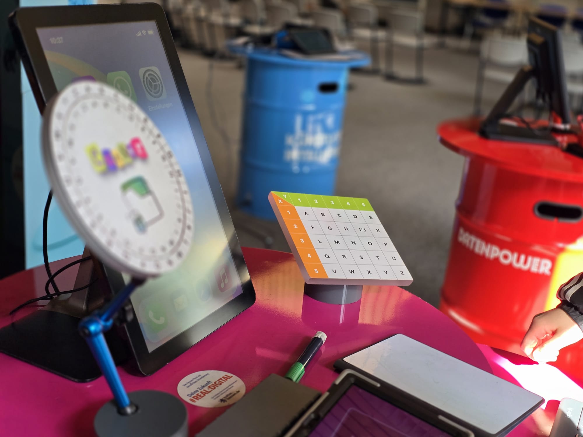 Für Schülerinnen und Schüler der Integrierten Gesamtschule bieten die Digi-Coaches Lisa Morath, Philipp Mertin und Fabio Benini einen 90-minütigen, interaktiven Rundgang an. Die Schülerinnen und Schüler erwarten insgesamt acht Stationen, die jeweils eine digitale Schlüsseltechnologie vorstellen. Dazu gehören kollaborative Robotik, das Internet der Dinge, Künstliche Intelligenz, Augmented Reality, Sensorik, Verschlüsselung, 3D-Scan sowie Big Data. Aufgeteilt in Kleingruppen lösen die Schülerinnen und Schüler an drei dieser Stationen jeweils eine spielerisch gestaltete Aufgabe und lernen dabei die Funktionsweise der vorgestellten Technologie und wie diese in unterschiedlichen Berufsfeldern eingesetzt wird. Informationen dazu erhalten sie im Sinne des Lernens mit digitalen Medien über eine interaktive Lernsoftware auf einem Tablet.
