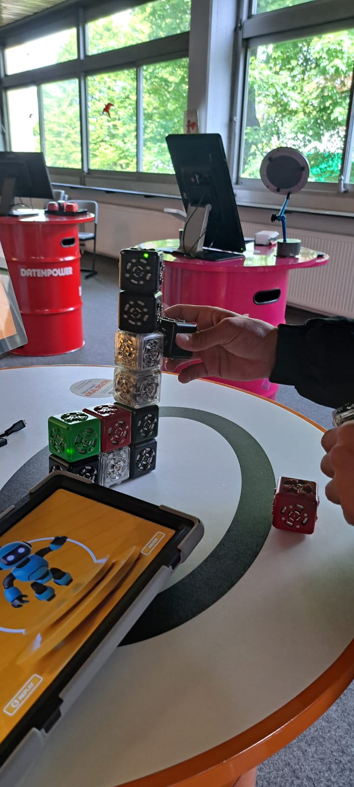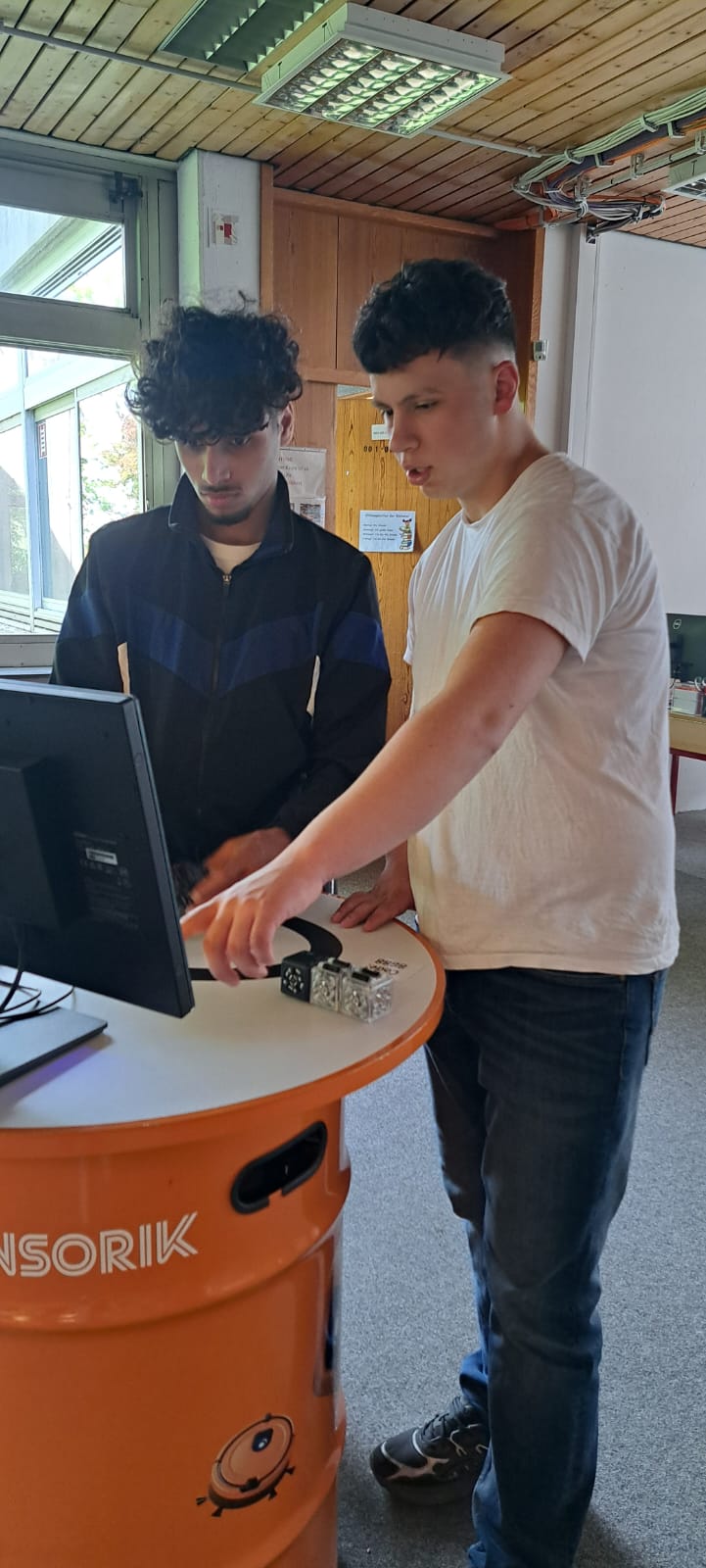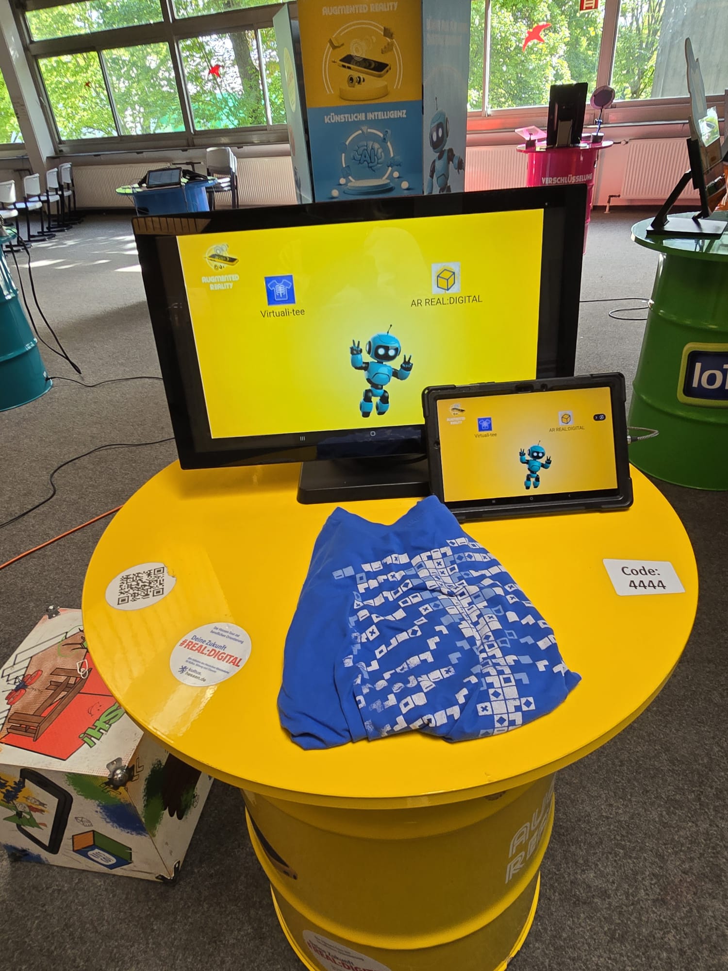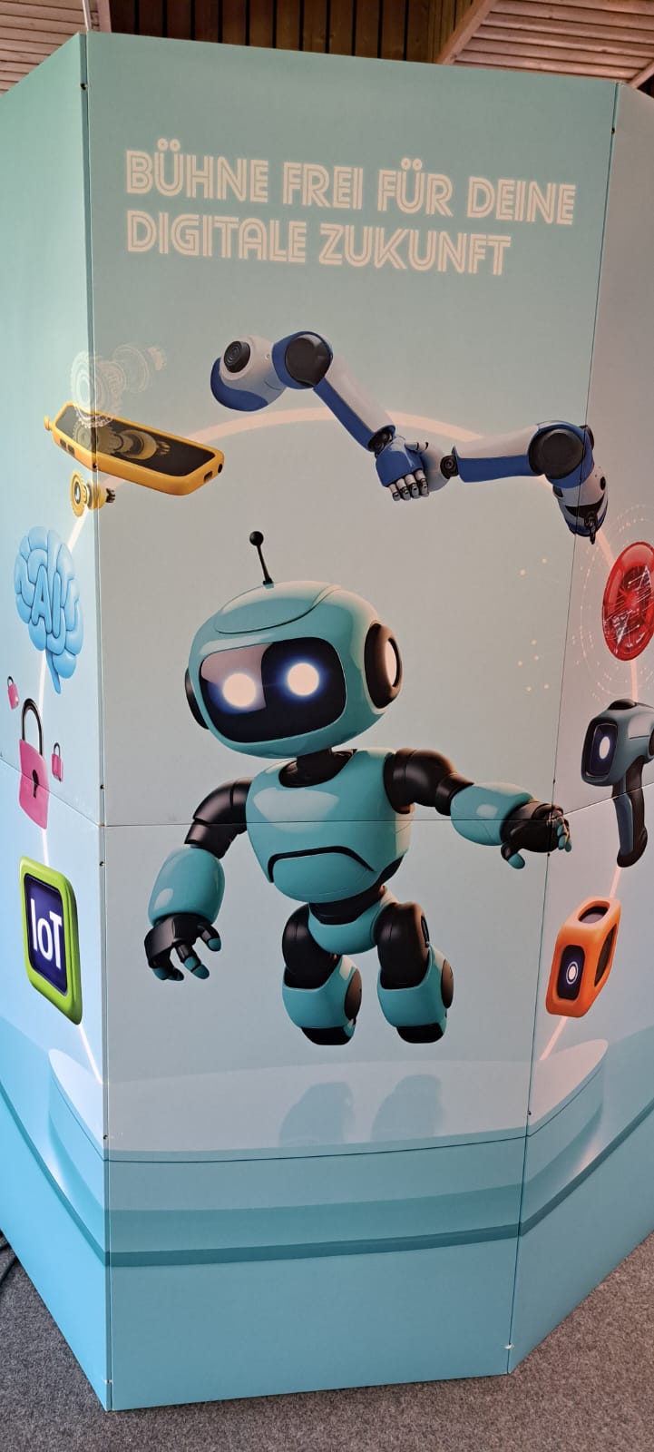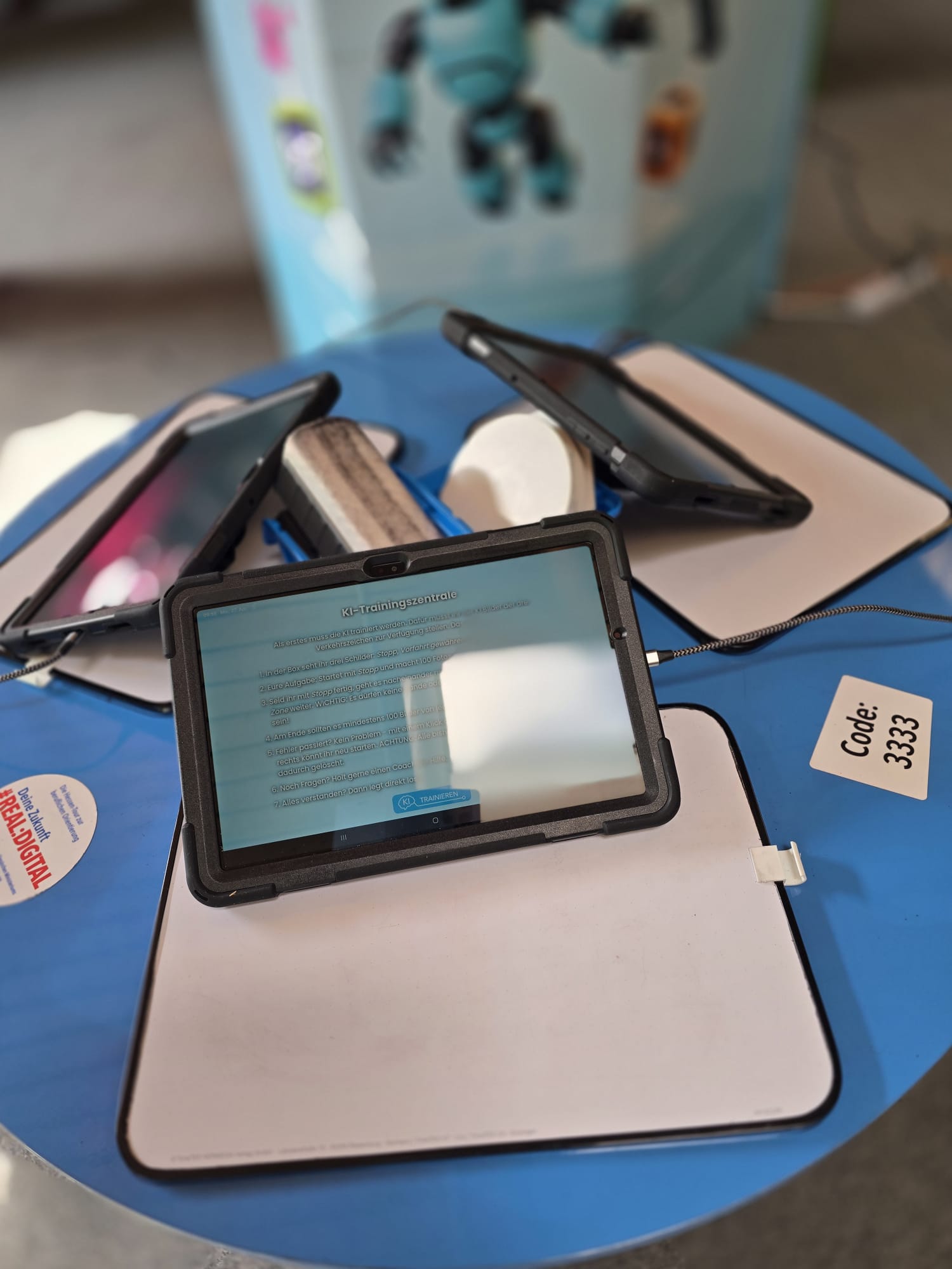 Für Schülerinnen und Schüler der Integrierten Gesamtschule bieten die Digi-Coaches Lisa Morath, Philipp Mertin und Fabio Benini einen 90-minütigen, interaktiven Rundgang an. Die Schülerinnen und Schüler erwarten insgesamt acht Stationen, die jeweils eine digitale Schlüsseltechnologie vorstellen. Dazu gehören kollaborative Robotik, das Internet der Dinge, Künstliche Intelligenz, Augmented Reality, Sensorik, Verschlüsselung, 3D-Scan sowie Big Data. Aufgeteilt in Kleingruppen lösen die Schülerinnen und Schüler an drei dieser Stationen jeweils eine spielerisch gestaltete Aufgabe und lernen dabei die Funktionsweise der vorgestellten Technologie und wie diese in unterschiedlichen Berufsfeldern eingesetzt wird. Informationen dazu erhalten sie im Sinne des Lernens mit digitalen Medien über eine interaktive Lernsoftware auf einem Tablet.