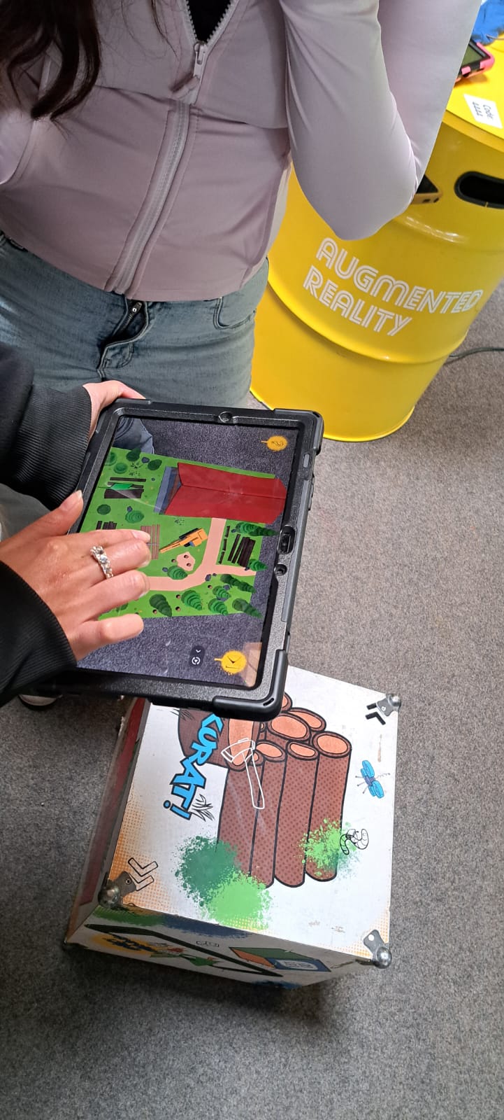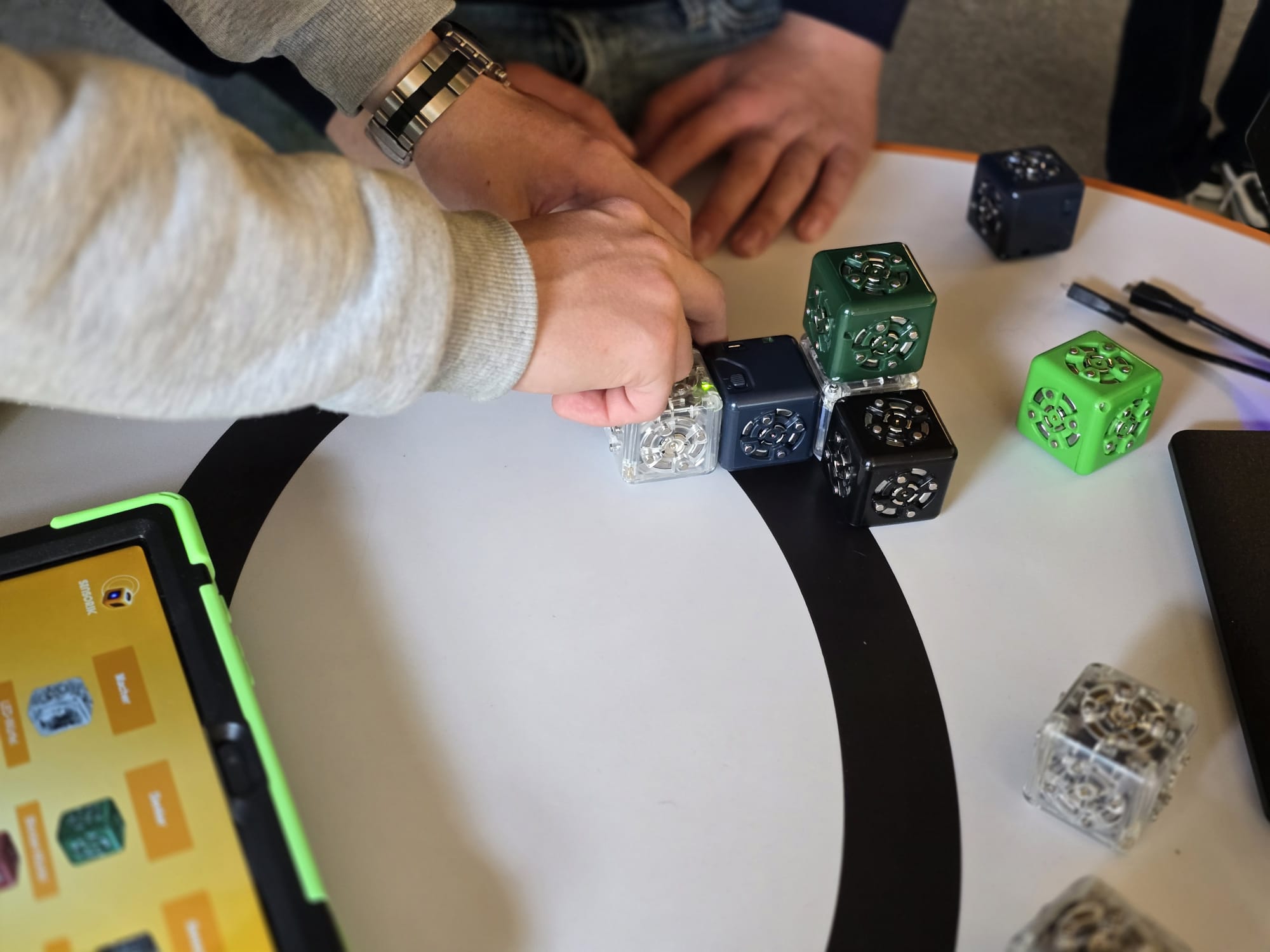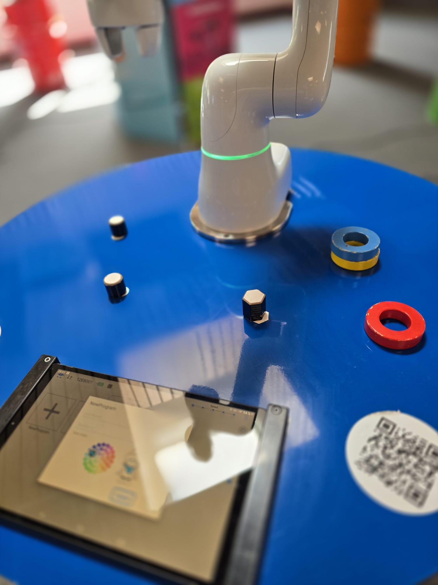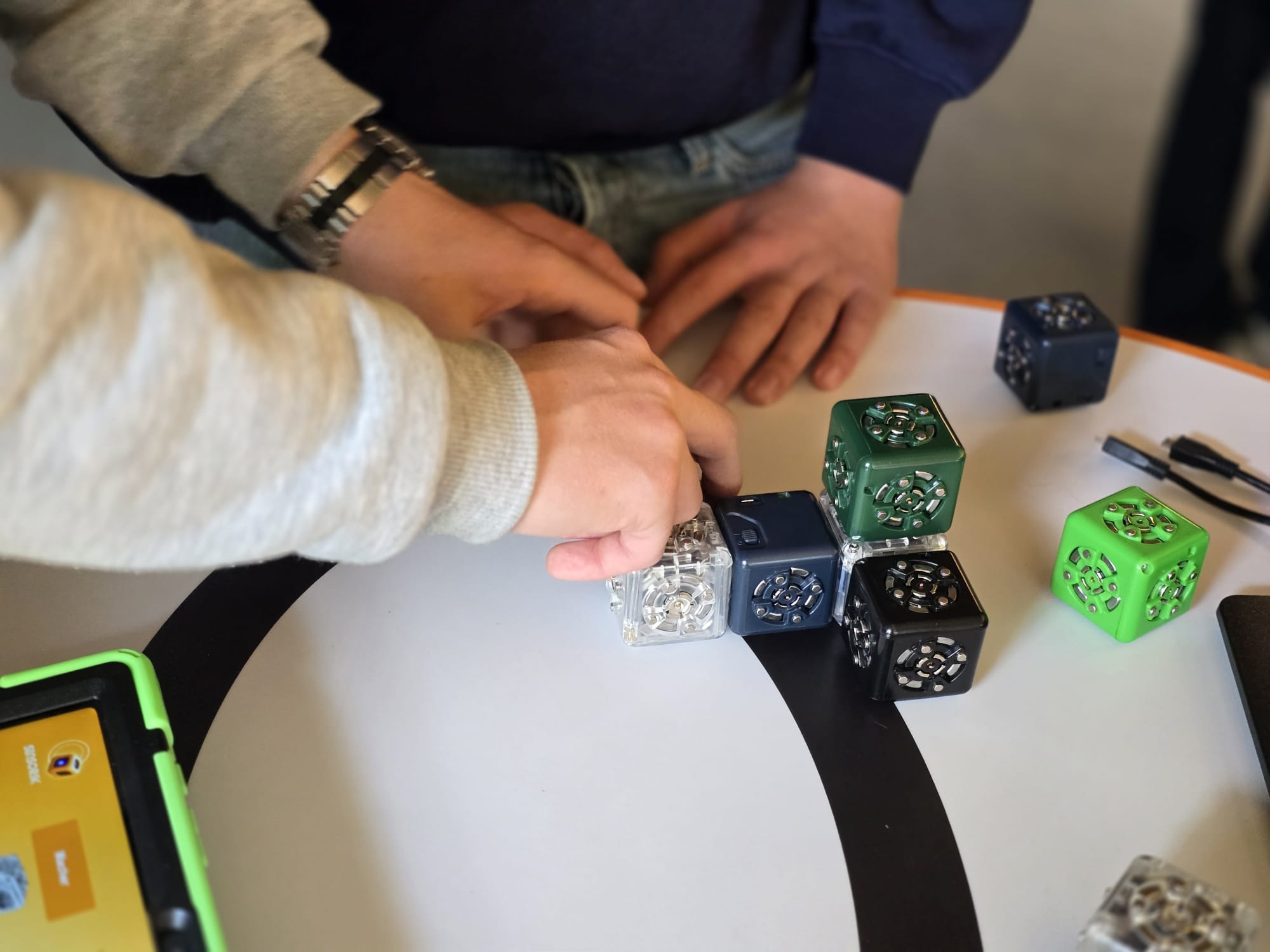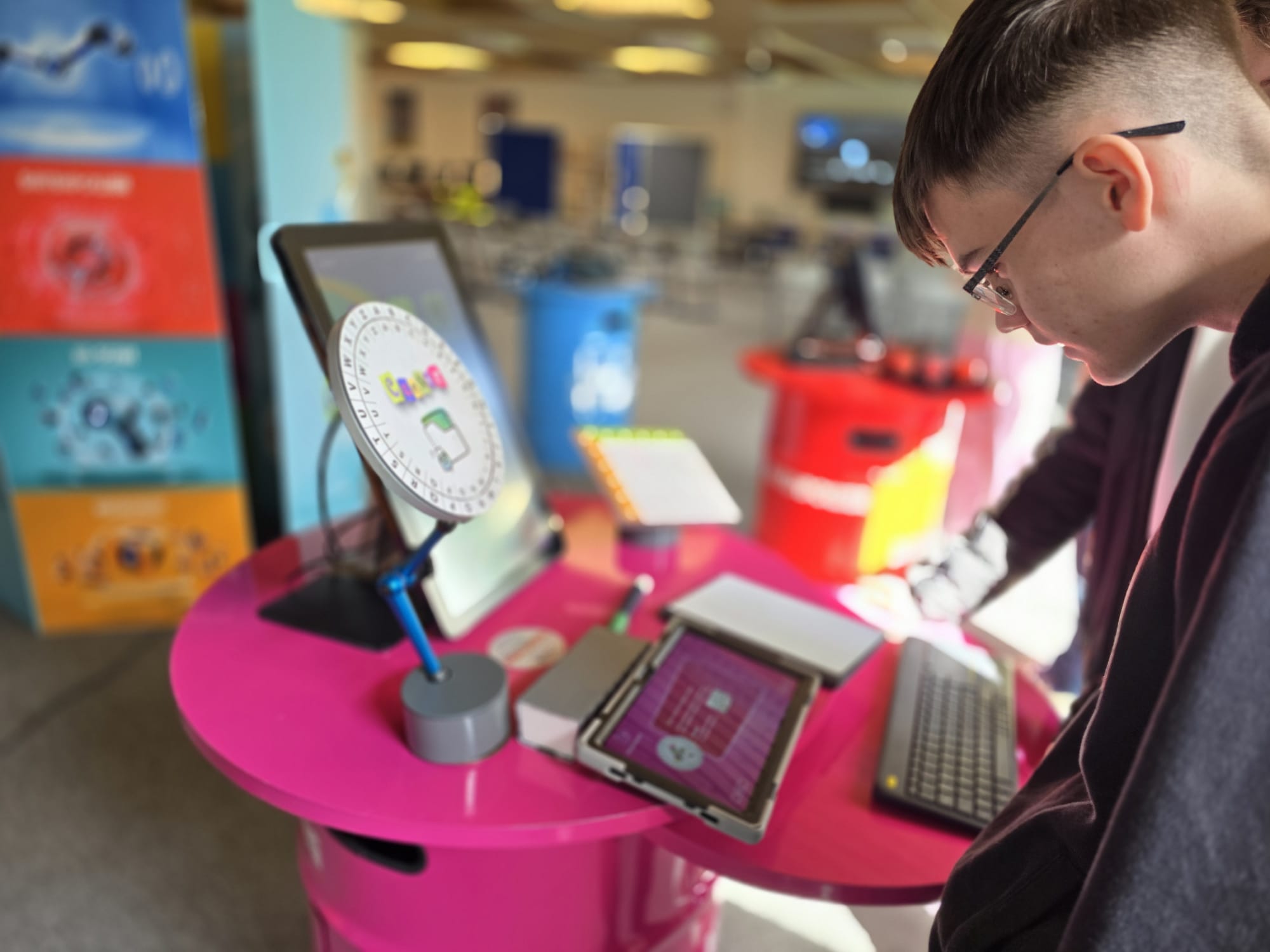 Für Schülerinnen und Schüler der Integrierten Gesamtschule bieten die Digi-Coaches Lisa Morath, Philipp Mertin und Fabio Benini einen 90-minütigen, interaktiven Rundgang an. Die Schülerinnen und Schüler erwarten insgesamt acht Stationen, die jeweils eine digitale Schlüsseltechnologie vorstellen. Dazu gehören kollaborative Robotik, das Internet der Dinge, Künstliche Intelligenz, Augmented Reality, Sensorik, Verschlüsselung, 3D-Scan sowie Big Data. Aufgeteilt in Kleingruppen lösen die Schülerinnen und Schüler an drei dieser Stationen jeweils eine spielerisch gestaltete Aufgabe und lernen dabei die Funktionsweise der vorgestellten Technologie und wie diese in unterschiedlichen Berufsfeldern eingesetzt wird. Informationen dazu erhalten sie im Sinne des Lernens mit digitalen Medien über eine interaktive Lernsoftware auf einem Tablet.