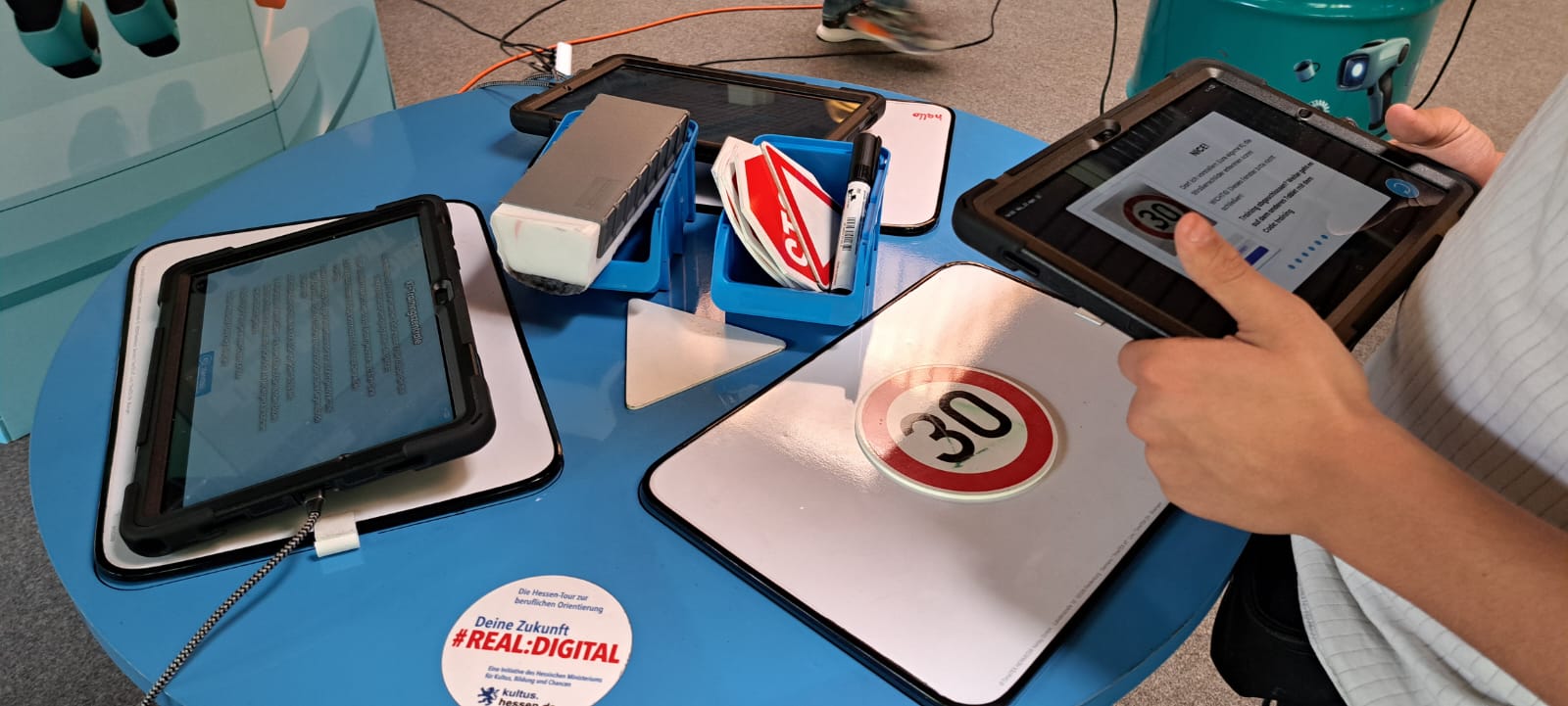 Digitale Kompetenzen sind schon heute in vielen Berufen eine wichtige Grundvoraussetzung. Was das genau bedeutet, und warum es wichtig ist, digitale Anwendungen nicht nur bedienen zu können, sondern sie auch zu verstehen – dabei hilft die Initiative Deine Zukunft #REAL:DIGITAL des Hessischen Ministeriums für Kultus, Bildung und Chancen, die von 27. bis 30.04.2026 die Heinrich-Böll-Schule in Bruchköbel besucht. Im Gepäck haben die Coaches eine mobile Mitmachausstellung, die direkt im Klassenzimmer zum Ausprobieren einlädt. An acht interaktiven Arbeitsstationen lernen die Schülerinnen und Schüler digitale Schlüsseltechnologien kennen und erfahren, wie diese die Arbeitswelt verändern. Am Beispiel ausgewählter Ausbildungsberufe erklären die Coaches, welche Chancen der Wandel für Jugendliche mit guten digitalen Fertigkeiten bietet.
