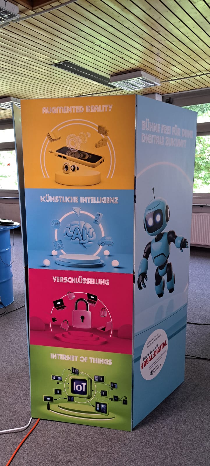 Ob Datenschutz, Künstliche Intelligenz oder Automatisierung – digitale Technologien sind heute allgegenwärtig und begleiten oft auch unbewusst unseren Alltag. Wo digitale Anwendungen immer wichtiger werden und wie sie die Arbeitswelt verändern, zeigt die Bildungsinitiative Deine Zukunft #REAL:DIGITAL des Hessischen Ministeriums für Kultus, Bildung und Chancen. Mit einer mobilen, interaktiven Lern-Ausstellung besucht die Initiative bereits seit 2022 weiterführende Schulen in Hessen, um über die Bedeutung digitaler Technologien in der Arbeitswelt zu informieren. Für Kultusminister Armin Schwarz eine Maßnahme, die sich bewährt hat: „Indem wir Jugendliche ab der 8. Klasse dafür motivieren, die Digitalisierung als Chance für ihre berufliche Zukunft zu begreifen und diese auch aktiv mitzugestalten, helfen wir ihnen, sich besser auf die Anforderungen während einer Ausbildung vorzubereiten.“ Von Montag bis Donnerstag, 27. bis 30. April 2026, kommen die Coaches der Initiative direkt ins Lernzentrum der Heinrich-Böll-Schule in Bruchköbel.